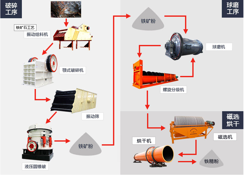 將符合選礦要求的鐵粉送入磁選機進行強磁選、磁選來除去雜物;將得到的鐵粉送入烘干機烘干就可以得到鐵精粉。